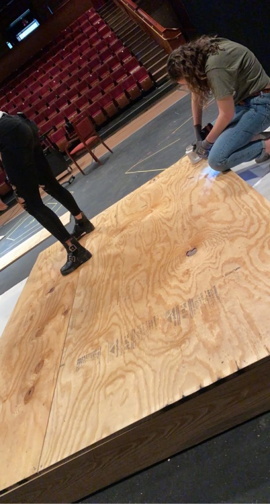 On. Mar. 17, I helped stack the platforms on top of each other to make a big stair case, kind of. Once they were in place, we screwed them. together so they wouldn’t shift when the actors walked on them. Then I helped Zac replace the legs of the platforms because they were too tall.