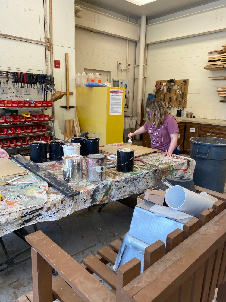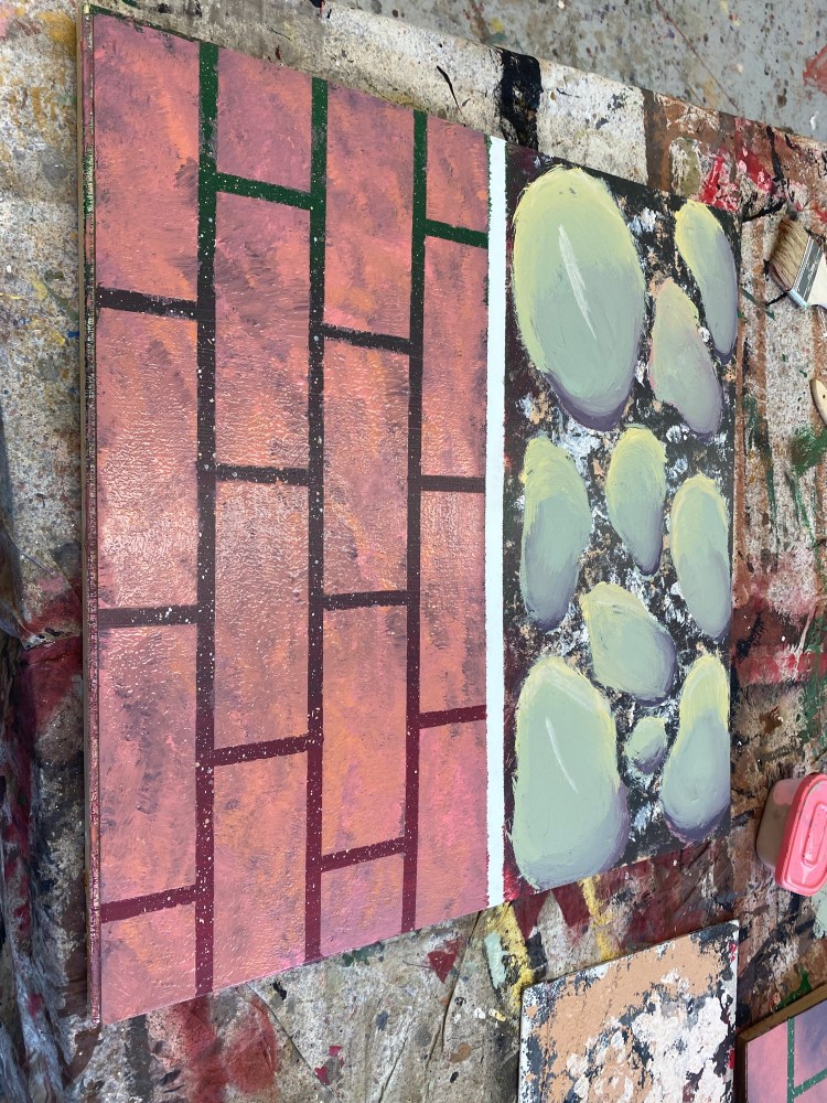 For painting, I had to do various techniques for painting and texture over the course of a month. Before I do anything, I put a piece of white, thin masking tape down the middle of the platform.