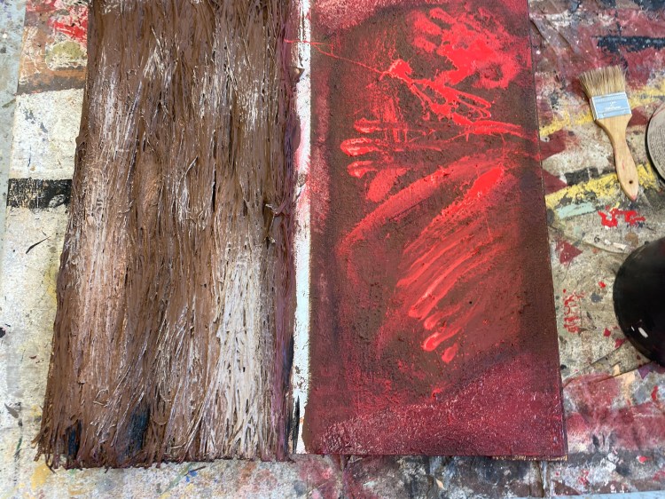 For the other side, I want free to do whatever I wanted. And because I was kind of fed up with the clay, I just took the excess clay and slapped it onto the canvas.