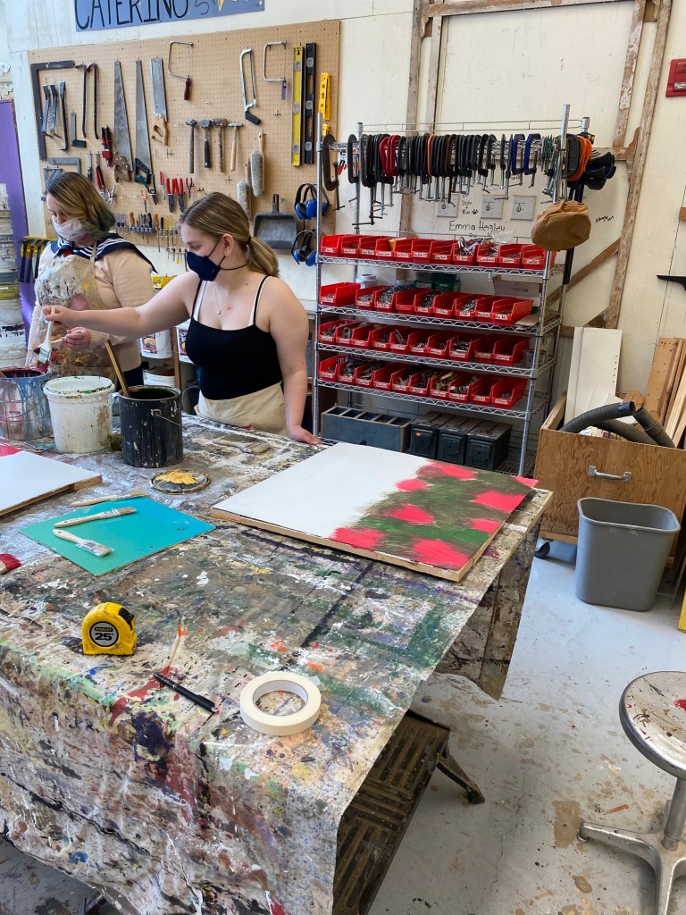 First, I took our platforms and started our first layer. On the left side, I take some red paint and paint in a criss-cross fashion on random parts of the canvas. Then, I dip my brush into a bucket of water to clean off the red paint and dip it into the green paint. I do the exact same thing I did with the red paint.