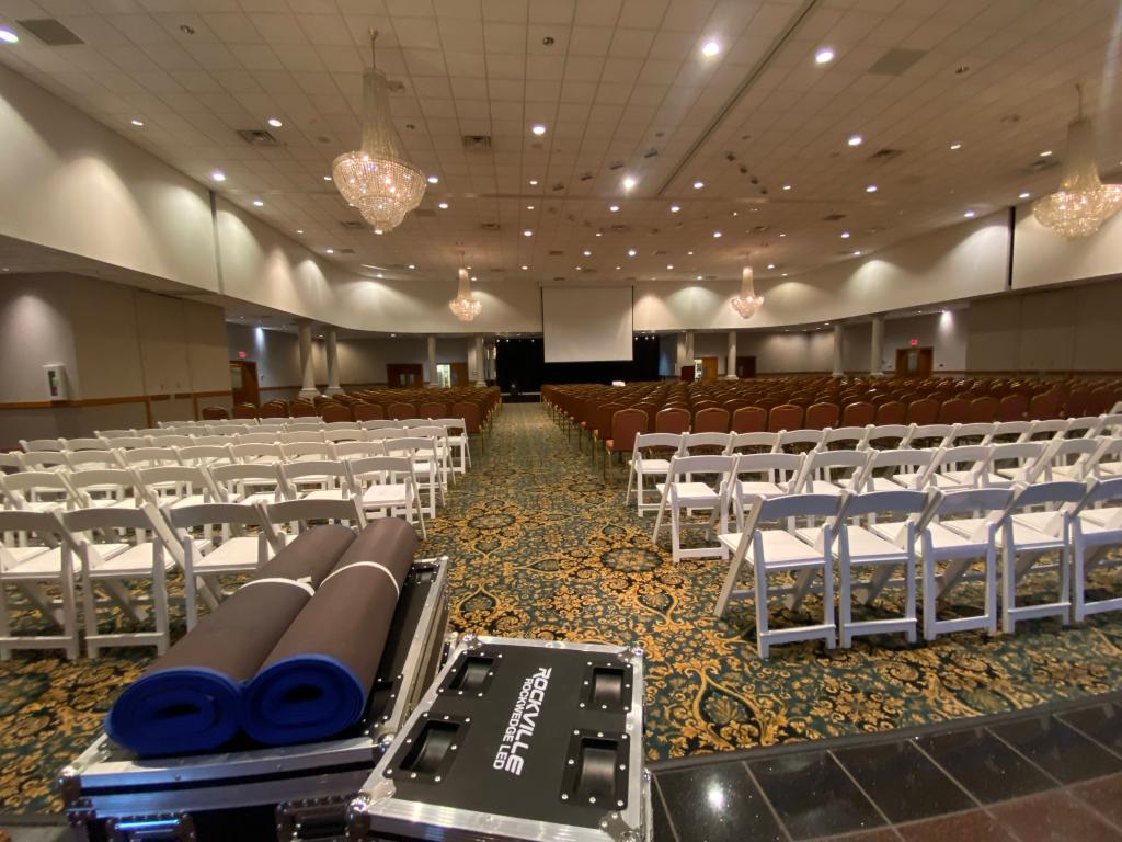 On Saturday, May 20th, Jason, Josh, and I arrived at the Veterans Memorial Center and started unloading the truck. We then started to wheel all the equipment to the lobby.