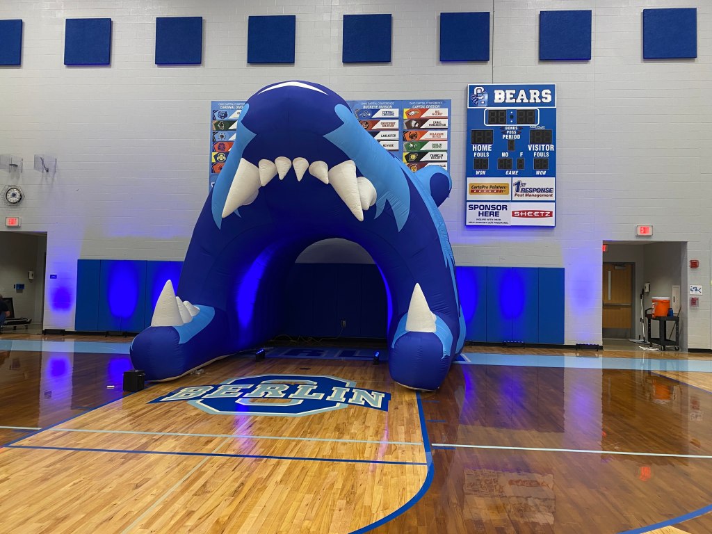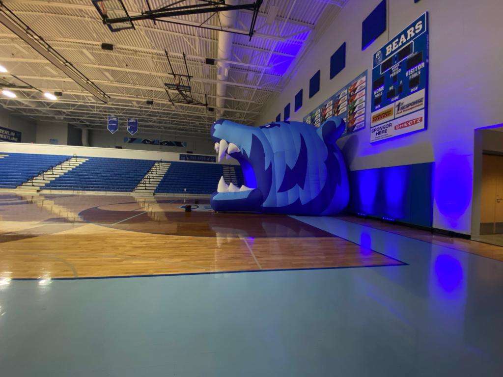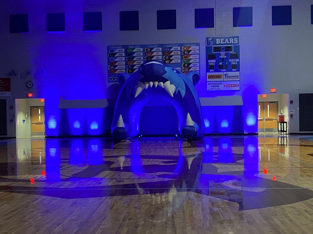 I set up the wireless lights with three on each side and four inside the inflatable bear’s mouth. I also got to test out some pyrotechnics that Steven set up. Once we were done, we wait until the pep rally to begin.