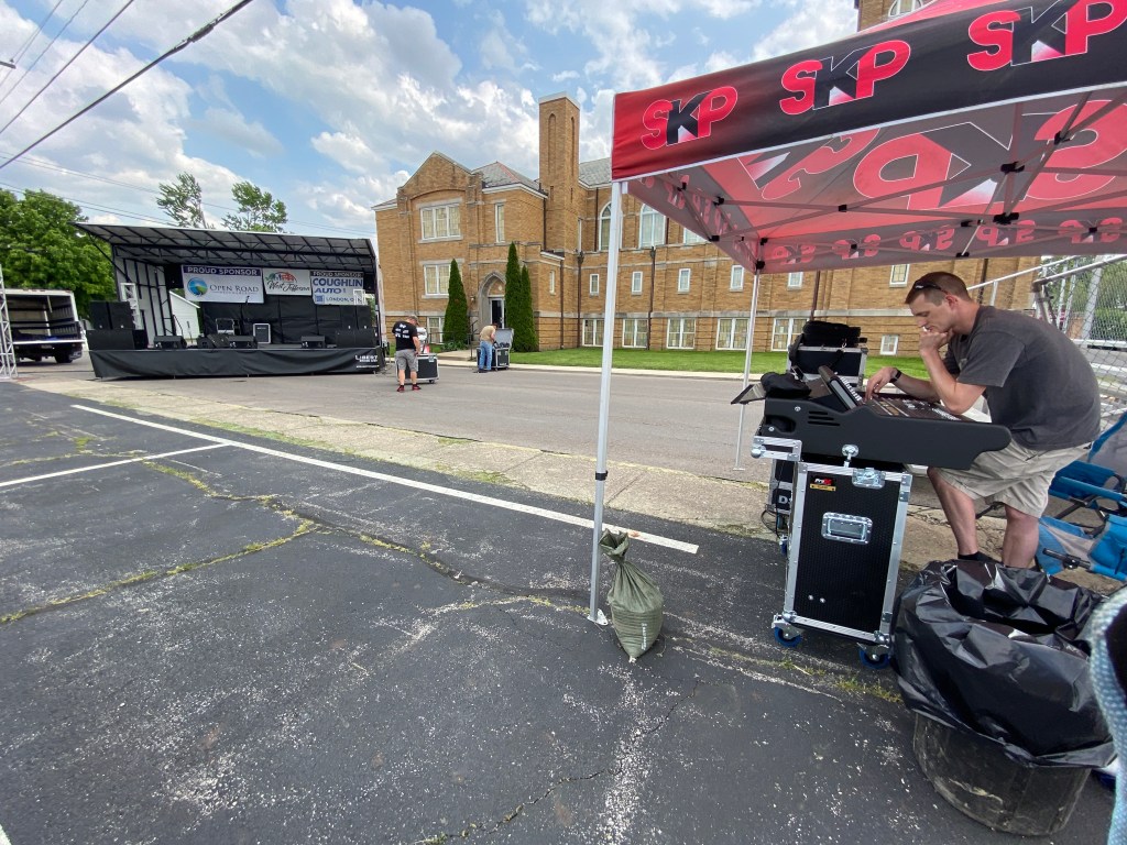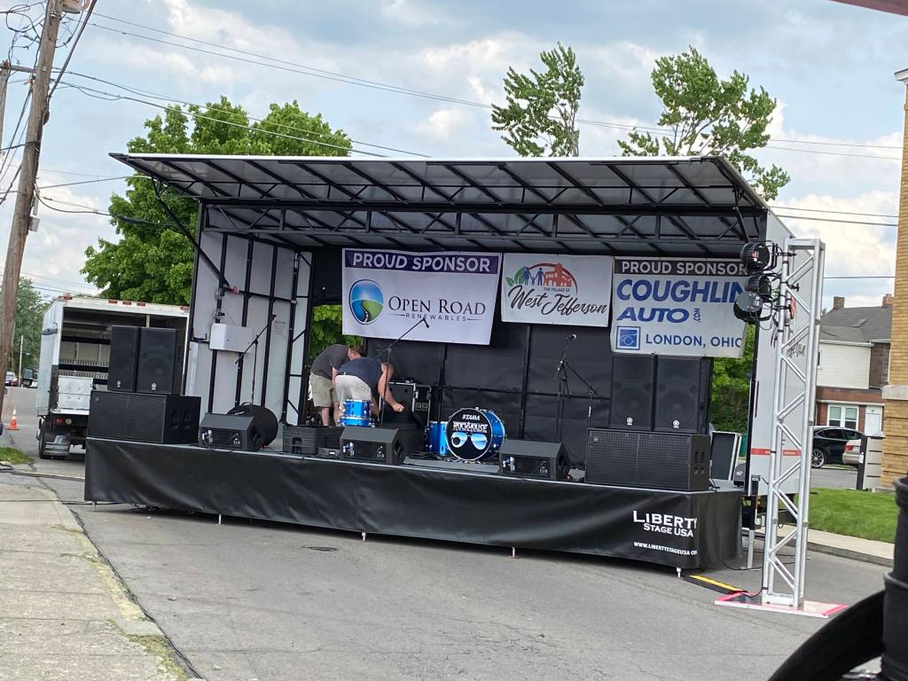Friday, May 19th, we set up lights and audio for the Rock House concert in West Jefferson. Since there was already a stage set up for the band, all we had to do was set up speakers, the audio board, and lighting. I made sure the cables that ran from the audio board to the audio box wasn’t a tripping hazard by pushing them against the curb.