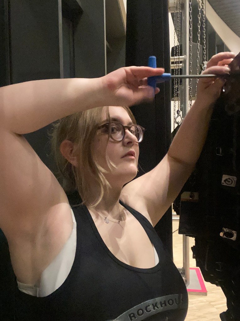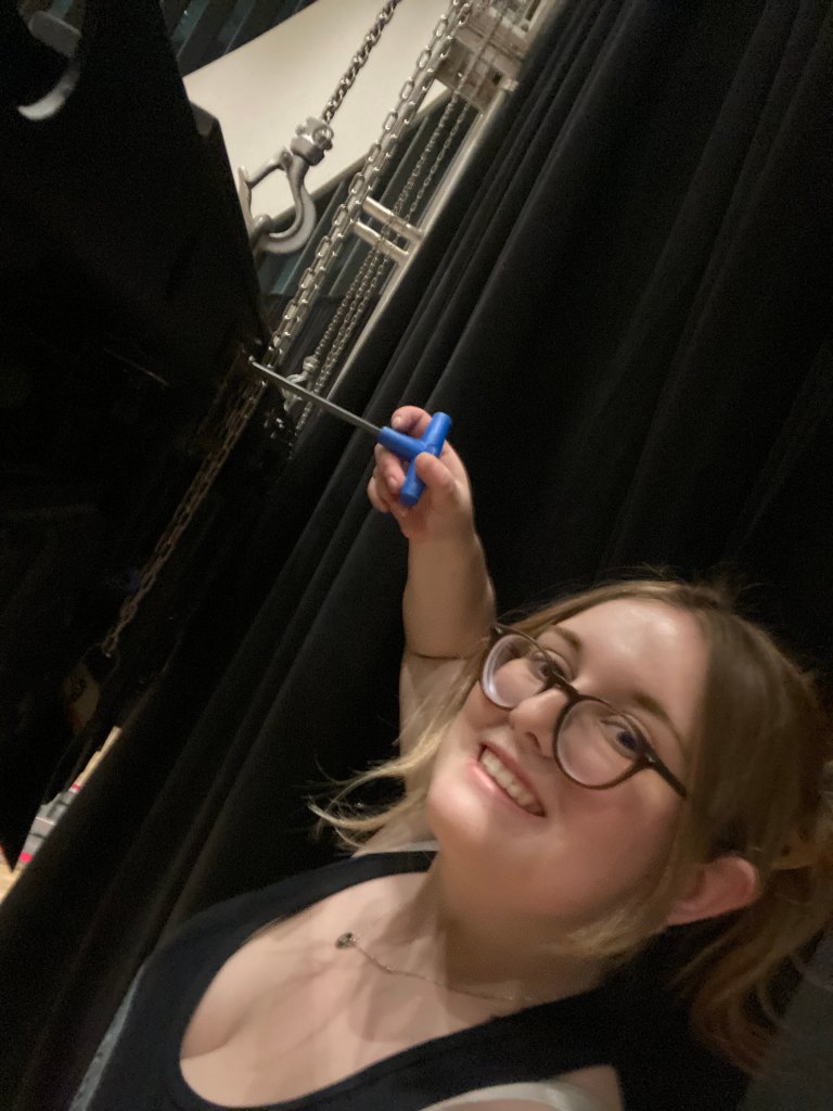 I started screwing two sets of three beams together with truss bolts. Then, I set up wireless lights on stage and in the beams. I helped hook video panels together to create two video walls on both sides of the stage and screwed video plates to video panels. Once everything was done, I got changed into the nice clothes I packed and hung out in the volunteer lounge. I came up to observe the event once it officially started.