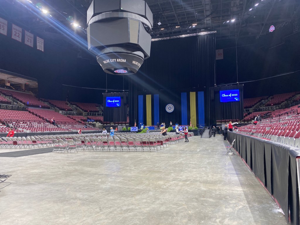Sunday, May 21st, Olentangy High Schools graduation. I woke at three in the morning and arrived at the site at four. I tucked a cable under the stage as to have no tripping hazards. I then helped put the video panels for one of the video walls together, and screwed in video plates. I then got changed into nice clothes, cleaned myself up, and observed the graduations. During that time, I brought Josh a 112 speaker, worked video for Olentangy Liberty Graduation, worked video for Olentangy Orange Graduation, brought drinks to coworkers, recycled used scripts, Grabbed more soda for crew members, and threw away some trash.