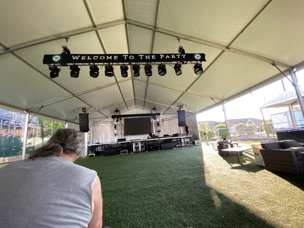 Tuesday, May 30th, we loaded two trucks and drove to the Bogey Inn. We put the stage and decking together, screwed beams together, hung banners, and hung beams with motors.